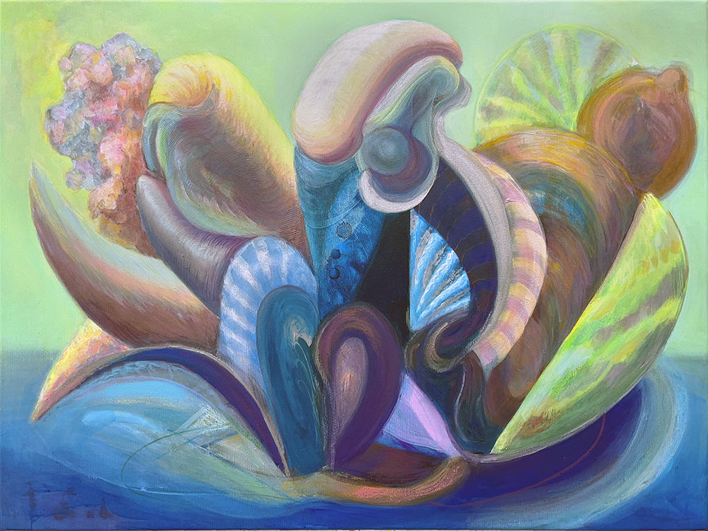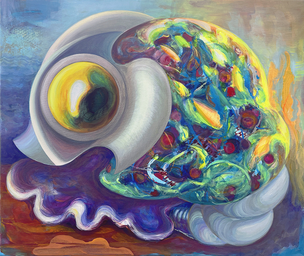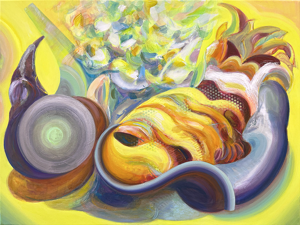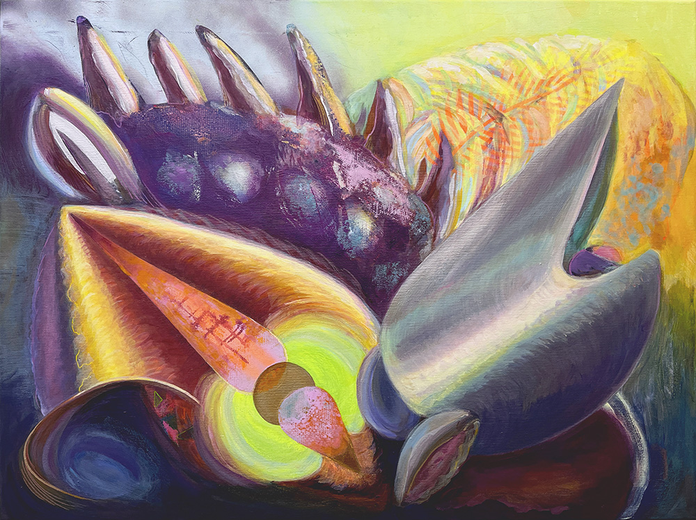 这些有关古怪、超自然战斗机器的变形绘画,似乎竭力地进入观者的空间中,并同时消解进抽象并融入背景当中。始自文艺复兴的传统技术与 VR 游戏技术的 动态视觉体验相融合。